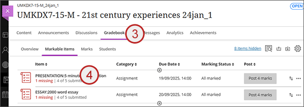 - On the Markable Items tab you will see a row for each assessment. Click on the relevant assignment name.