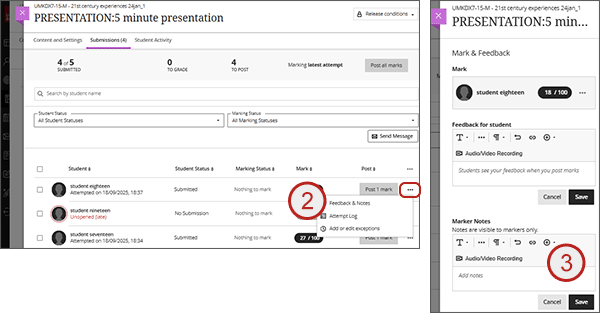 Please note that there is still only one mark field on the attempt page which will contain the first mark. The UWE recommendation is for the second marker to view the first marking recorded on the attempt but not to edit it. The second marking should be recorded by the second marker in the Marker Notes facility in the Gradebook and the attempt mark and feedback updated with the final agreed mark. At the time of writing, there is no link to the Marker Notes from the Allocation tool and so it would require the second marker to manually access the Marker Notes directly from the Gradebook. We are hoping to provide a direct link to the Marker Notes in a future release.