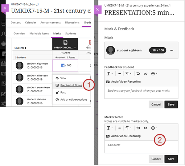 Marker notes can be accessed in the Gradebook in the following ways:- Markable Items tab: