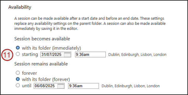 Note: If you wish to make a session unavailable to students until further notice it is recommended that you set a date in the distant future, i.e. 2050.