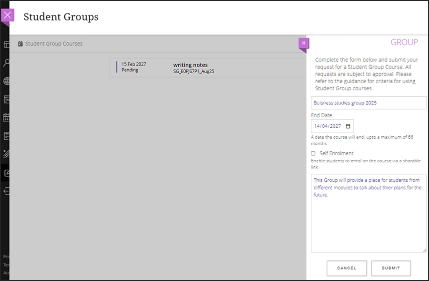 Approval is required to set up a new Student Group Course. They must not be used to replace a module run or Programme course, and they must have a set end date.